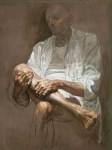 Il percorso sembra macinare ogni cosa, riminiscenze informali, iperrealismo, lezioni della grande pittura rinascimentale per arrivare ad un risultato che fa della com-passione il proprio tratto distintivo. Parlo qui delle opere pittoriche, perché poi la mostra dava atto anche delle sue qualità notevolissime nel campo della grafica e quel che prima era compassione qui diviene gioco intellettuale, grazia, scherzo, fantasia, quasi che il tratto liberato dalla costrizioni del colore riuscisse alleggerito, più sereno, calmo, divertente.
