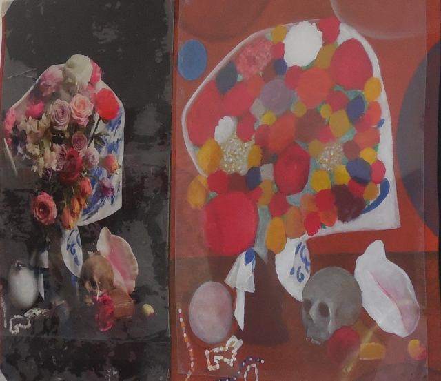 Ricetta della domenica: prendete una foto pubblicitaria dalla vostra rivista preferita, ritagliatatela e incollatela su una metà della carta da acquerello, precedentemente preparata per questo scopo. Nella metà rimasta libera copiate a vostro piacimento l’immagine fotografica. Finito il tutto, prendete tre sottili lamine di plastica trasparente e incollatele con vinavil abbondante sulla immagine fotografica. Poi prendete un’unica lamina della stessa plastica e incollatene delicatamente solo i bordi e gli angoli all’immagine dipinta. Esponete alla luce e fotografate, creando effetti “artistici” con i giochi di luce rilevati dalla macchina fotografica.