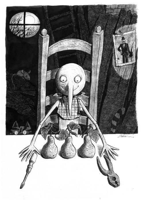 Fabio: Il bianco e nero racconta più cose del colore, è più espressivo. Nel Pinocchio ho usato fondamentalmente due registri. Alcune tavole sono ” bianche “, meno affollate di tratti e con atmosfere più luminose; altre più notturne, dove esploro le penombre. In genere se uso la penna o la matita coloro con l’ acquarello. Invece con l’ acrilico ci si può affidare di più al gesto pittorico. Ci sono poi le tecniche miste, i collage, gli stencil e naturalmente il lavoro in digitale che è un altro mondo, ma che di base è influenzato dalla tua formazione tradizionale di pittore e disegnatore.
