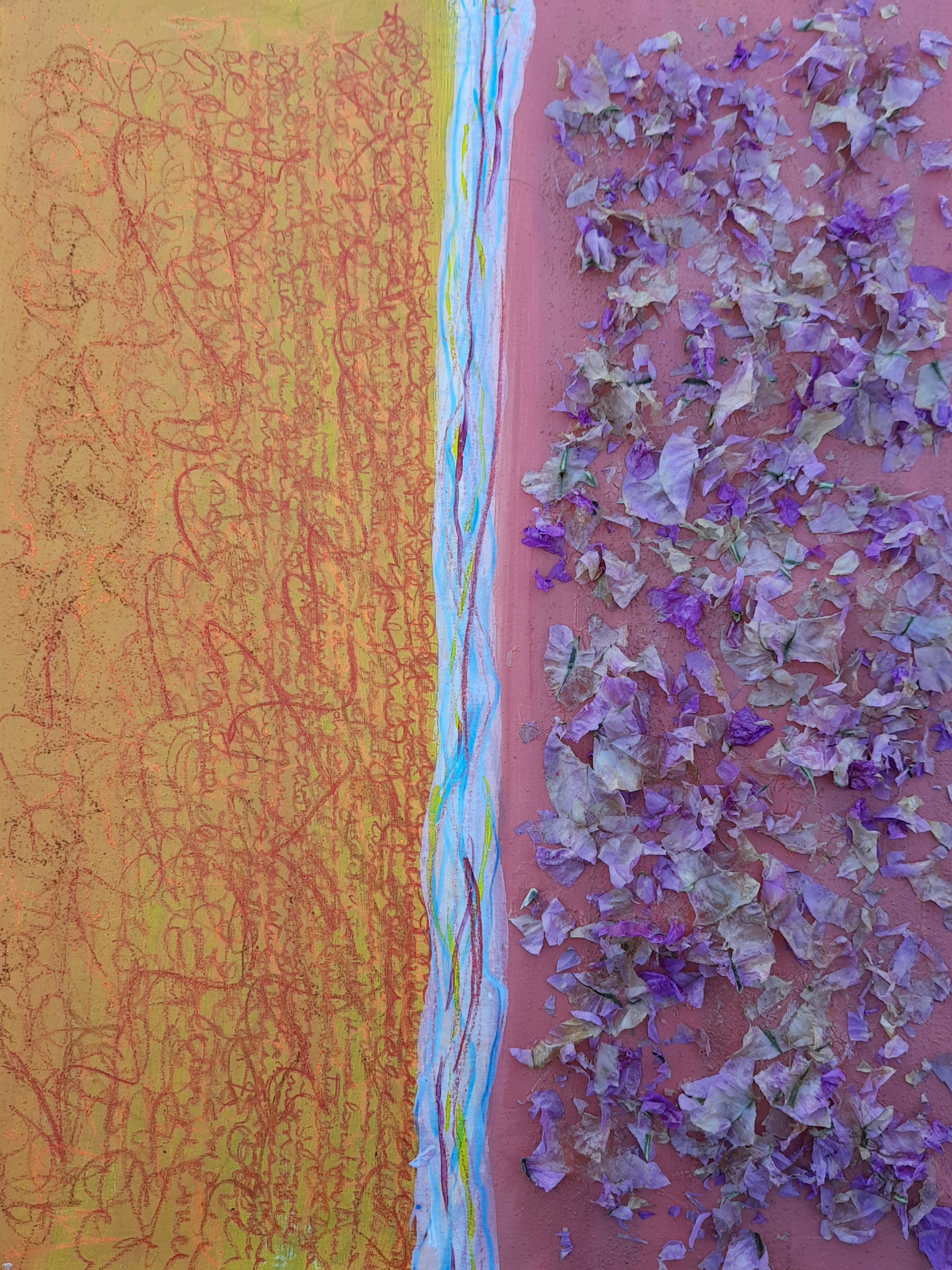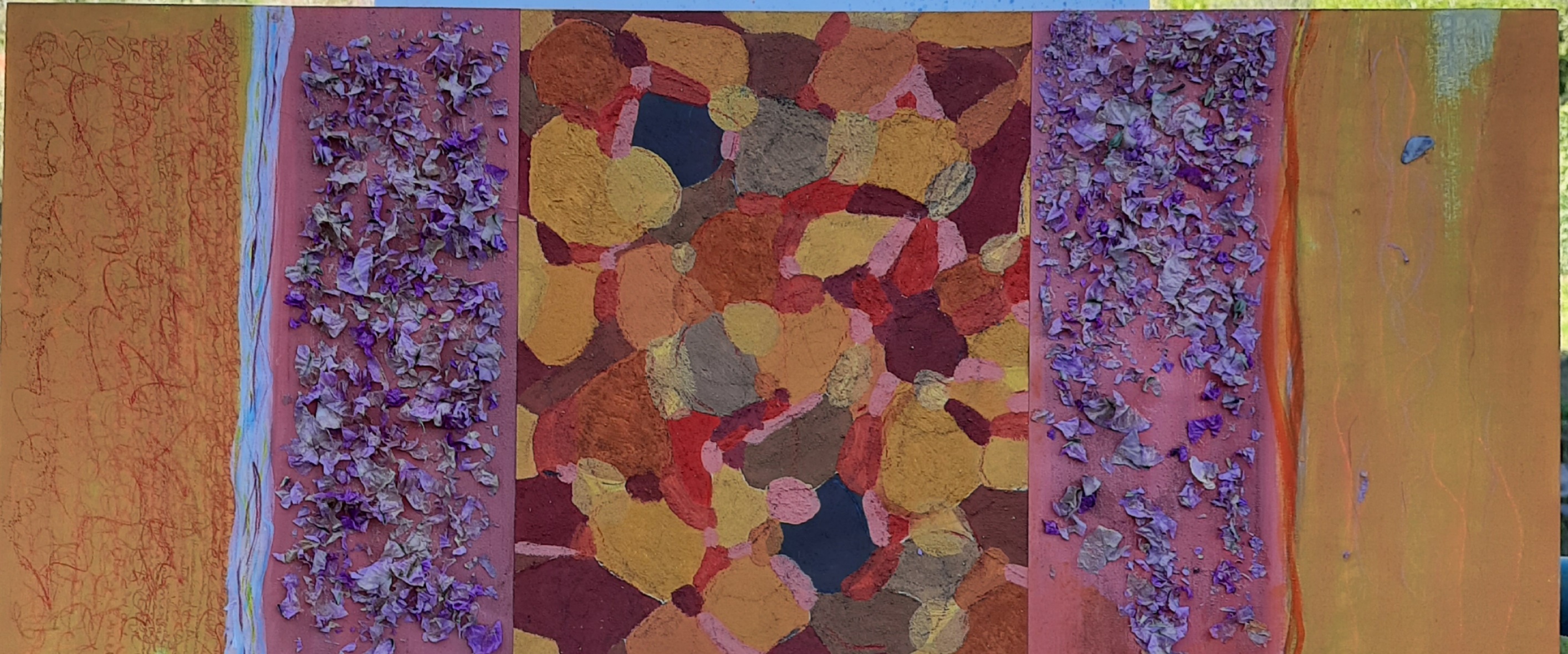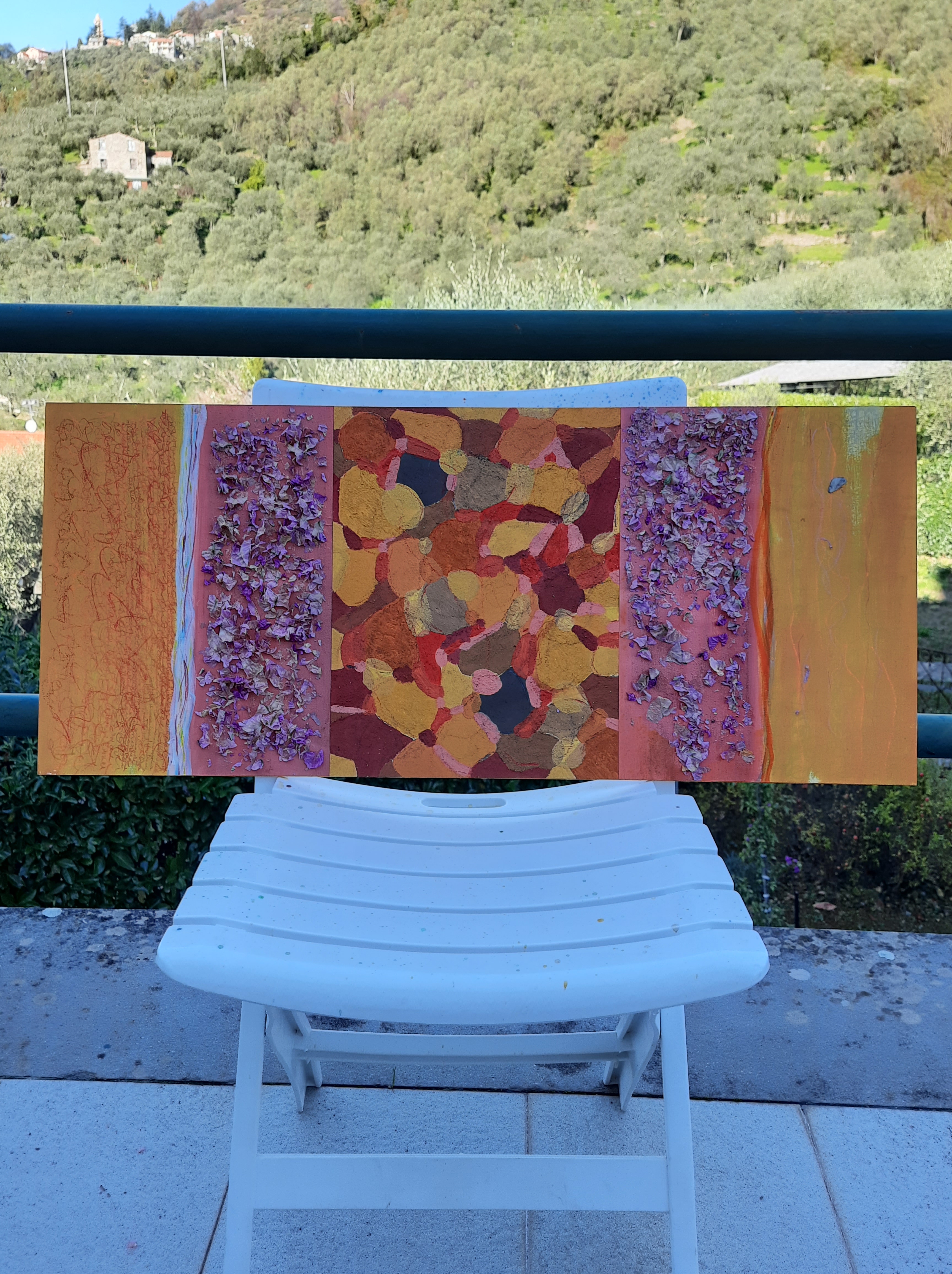 Altra composizione in 3 movimenti. Sempre acrilici su carta incollata su tavola. Dimensioni complessive 81×35