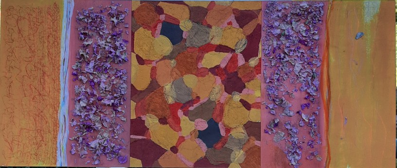 Altra composizione in 3 movimenti. Sempre acrilici su carta incollata su tavola. Dimensioni complessive 81×35