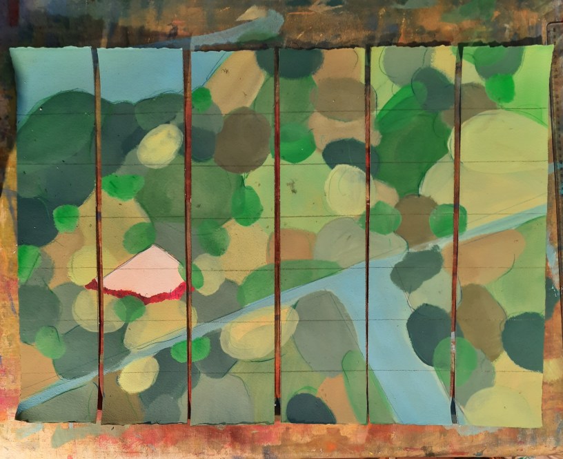 Quest’anno ho invertito il processo: ho dipinto un’unica opera (la collina di fronte al moo sgudio) che poi ho scomposto in 42 biglietti d’auguri. Un’unica opera scomposta, adesso, in 42 piccole opere.