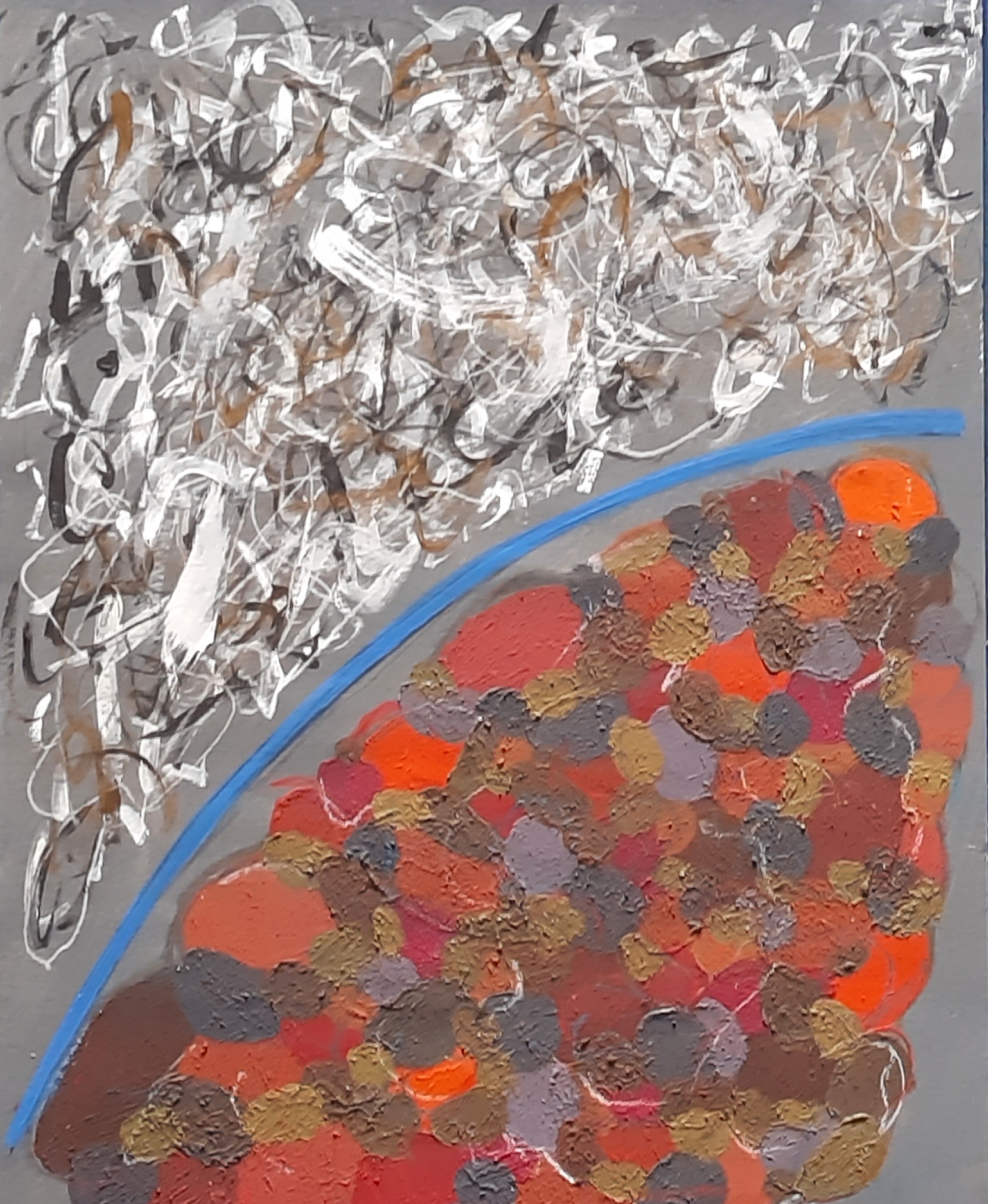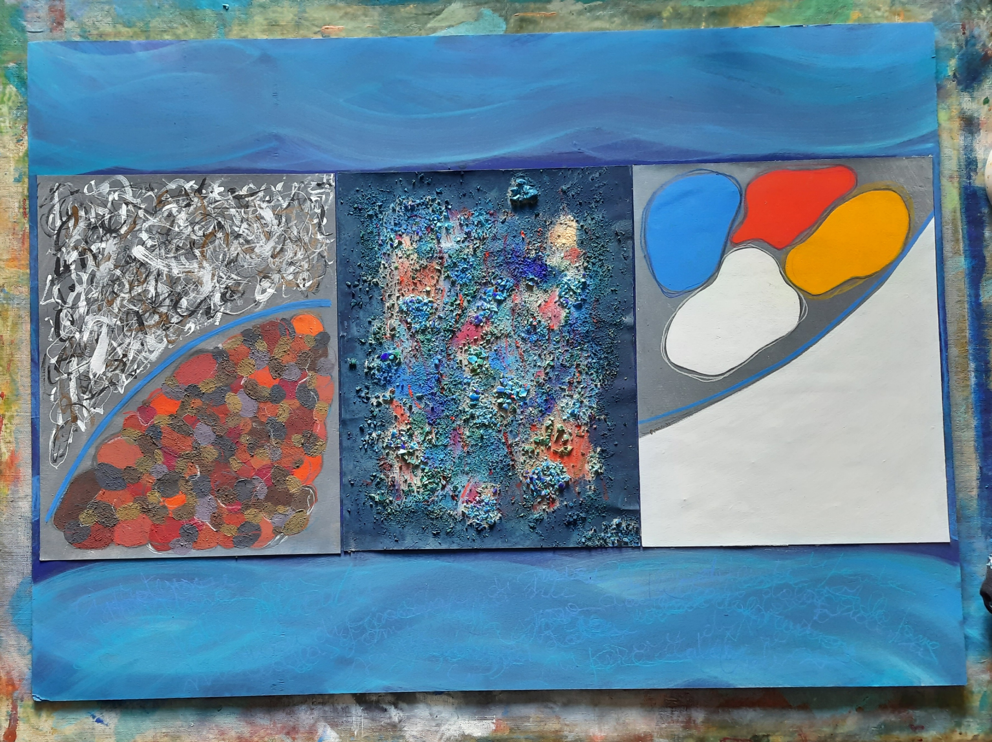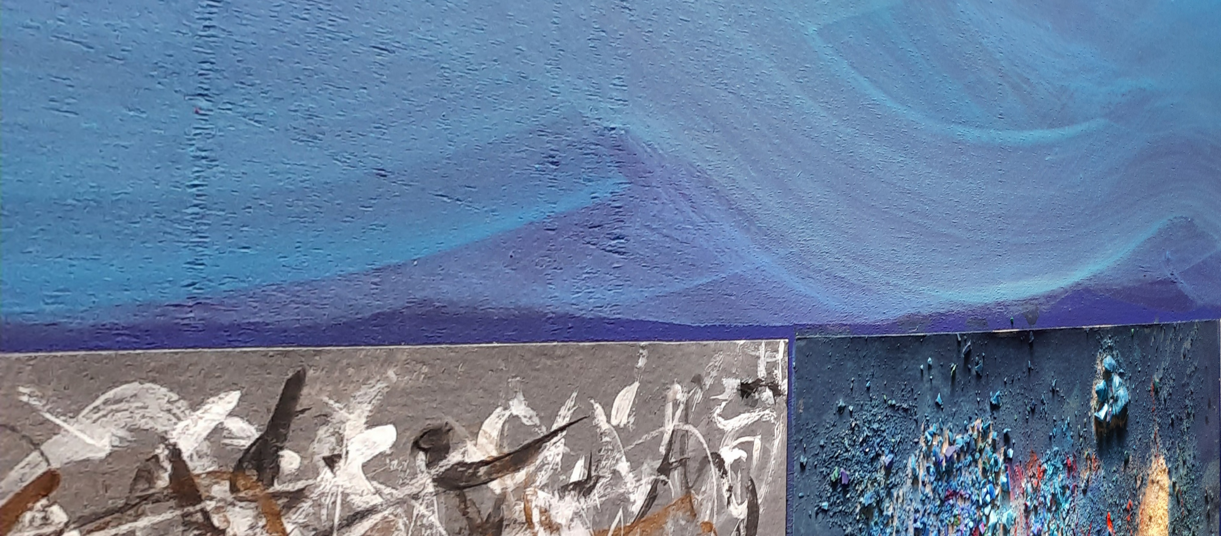 Sono 3 carte in acrilico e materiali (una) incollate su legno. La dimensione complessiva è 83×60.