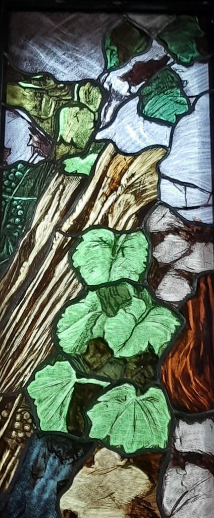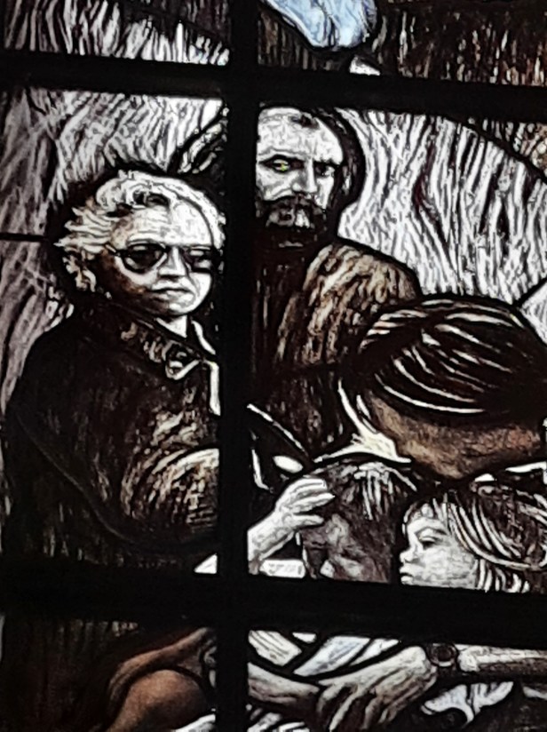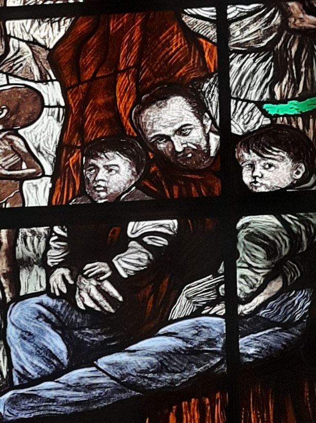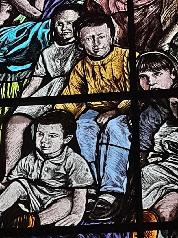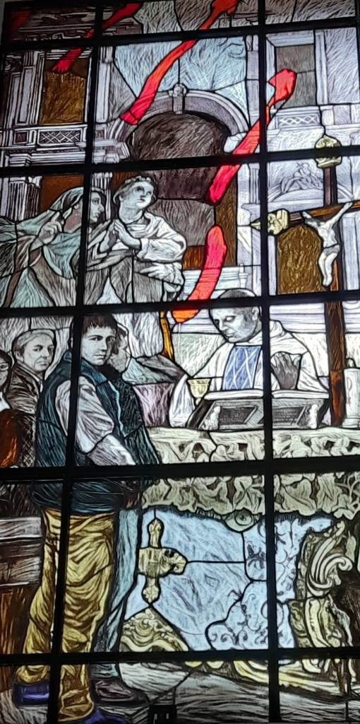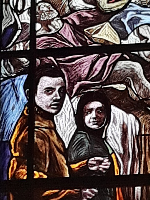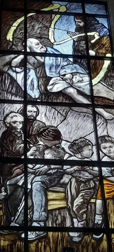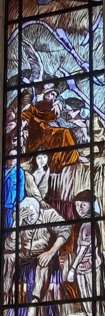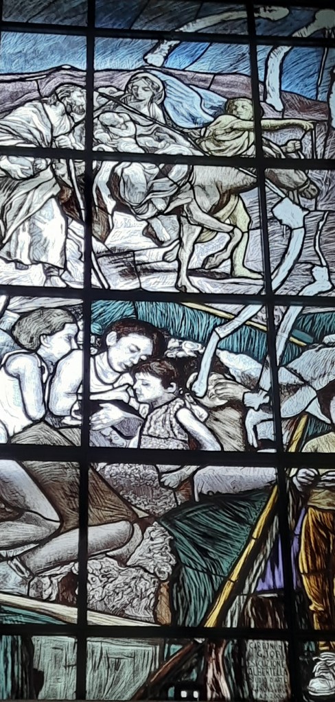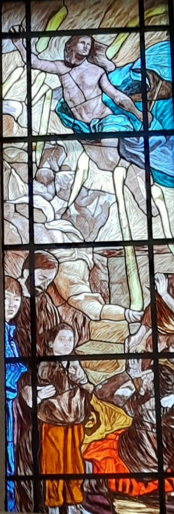 Di Giovanni ho più volte scritto su questo blog. Un maestro nella incisione e nella pittura. Le vetrate vanno viste con piena luce, meglio al mattino o a mezzogiorno, dato che il lato maggiormente esposto alla luce della Chiesa è ad Est.