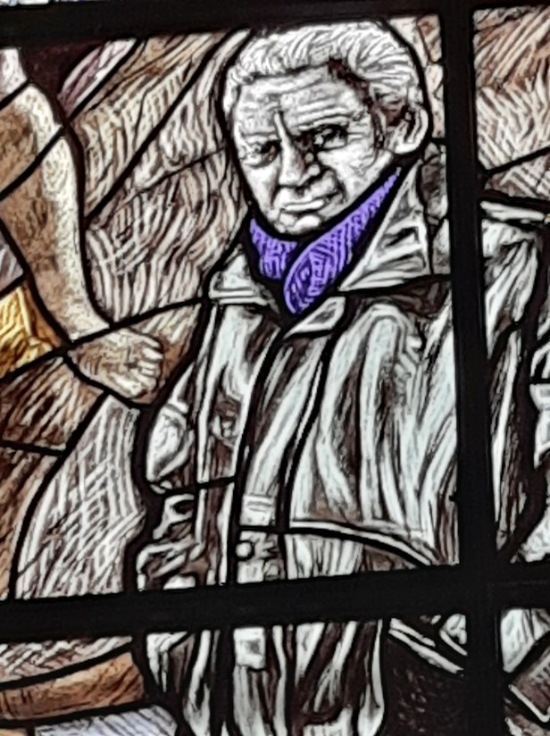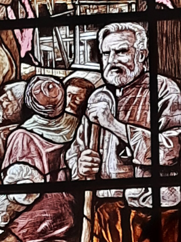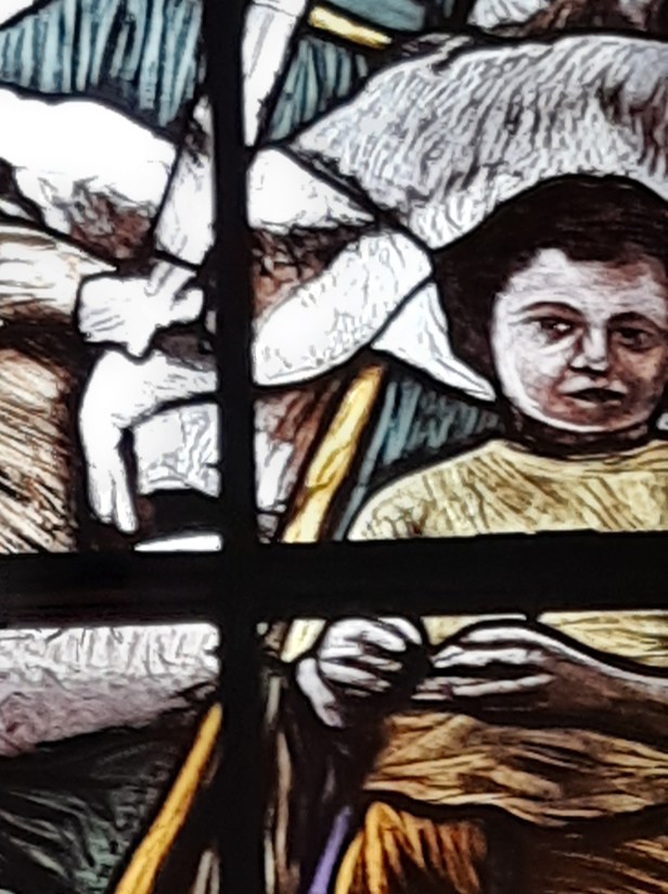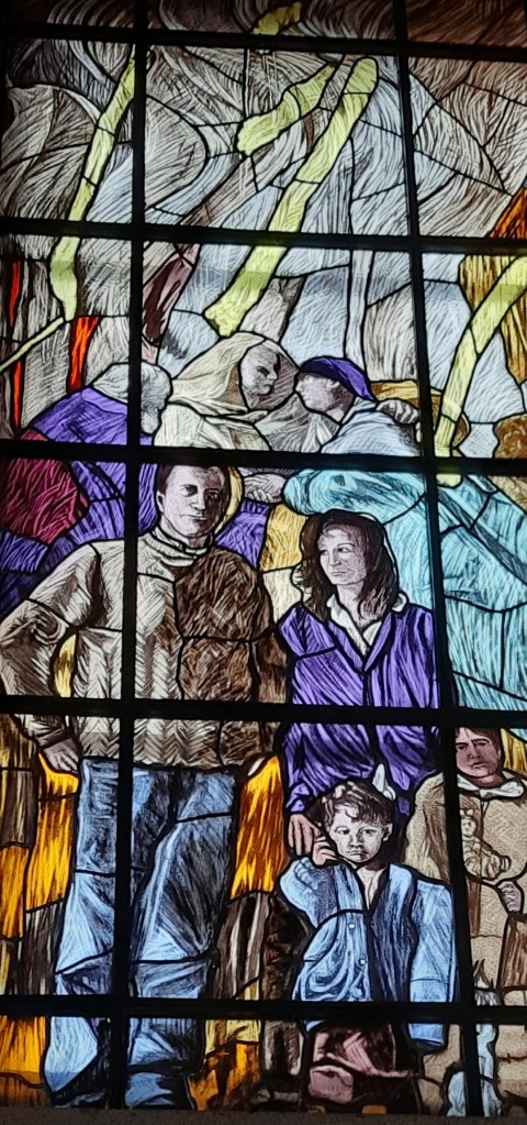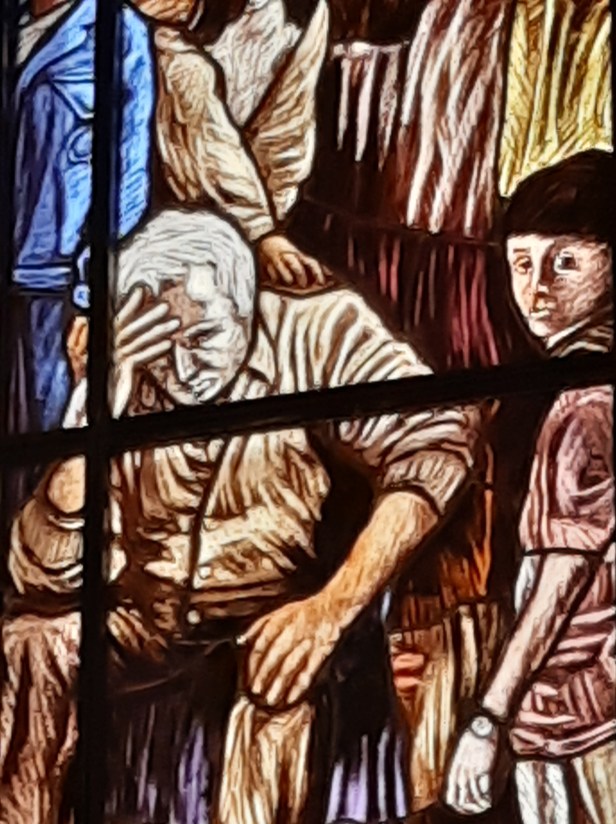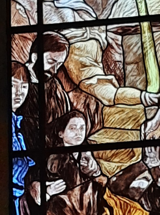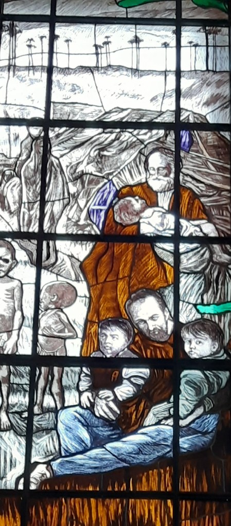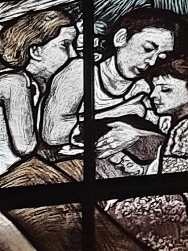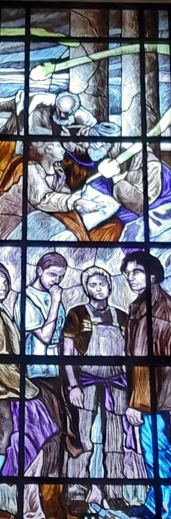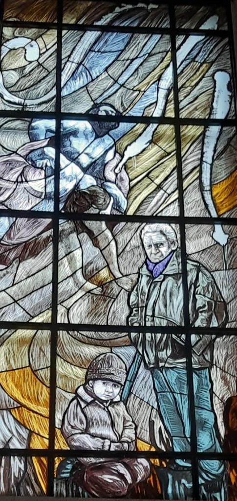 Di Giovanni ho più volte scritto su questo blog. Un maestro nella incisione e nella pittura. Le vetrate vanno viste con piena luce, meglio al mattino o a mezzogiorno, dato che il lato maggiormente esposto alla luce della Chiesa è ad Est.