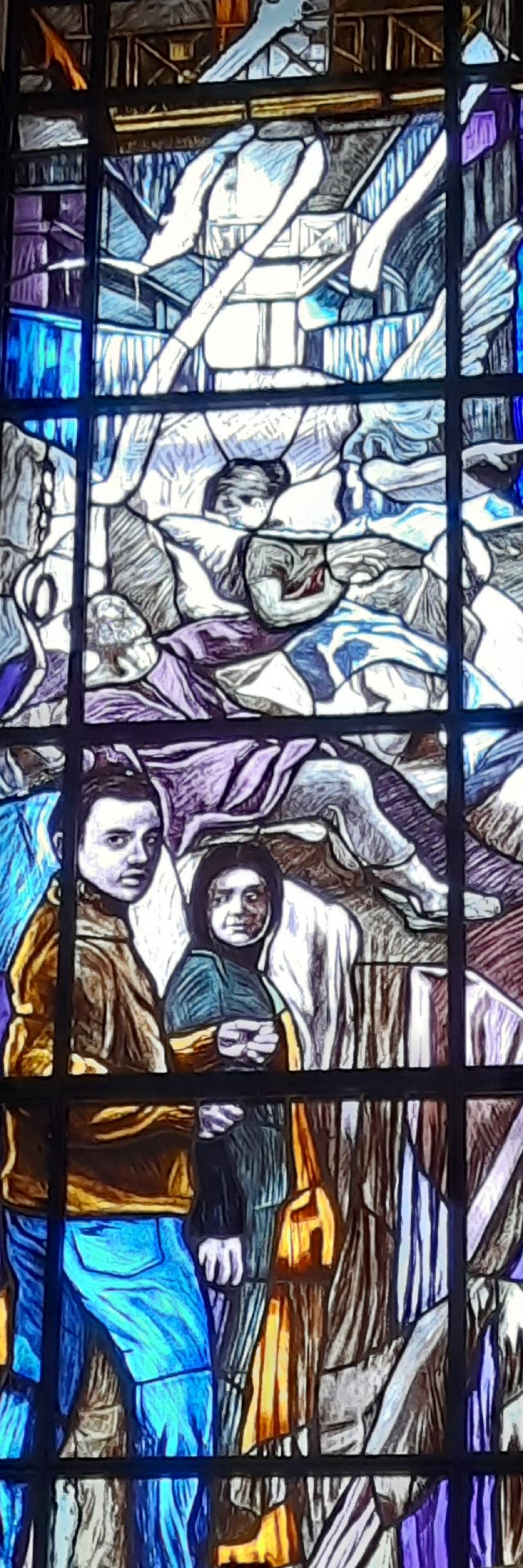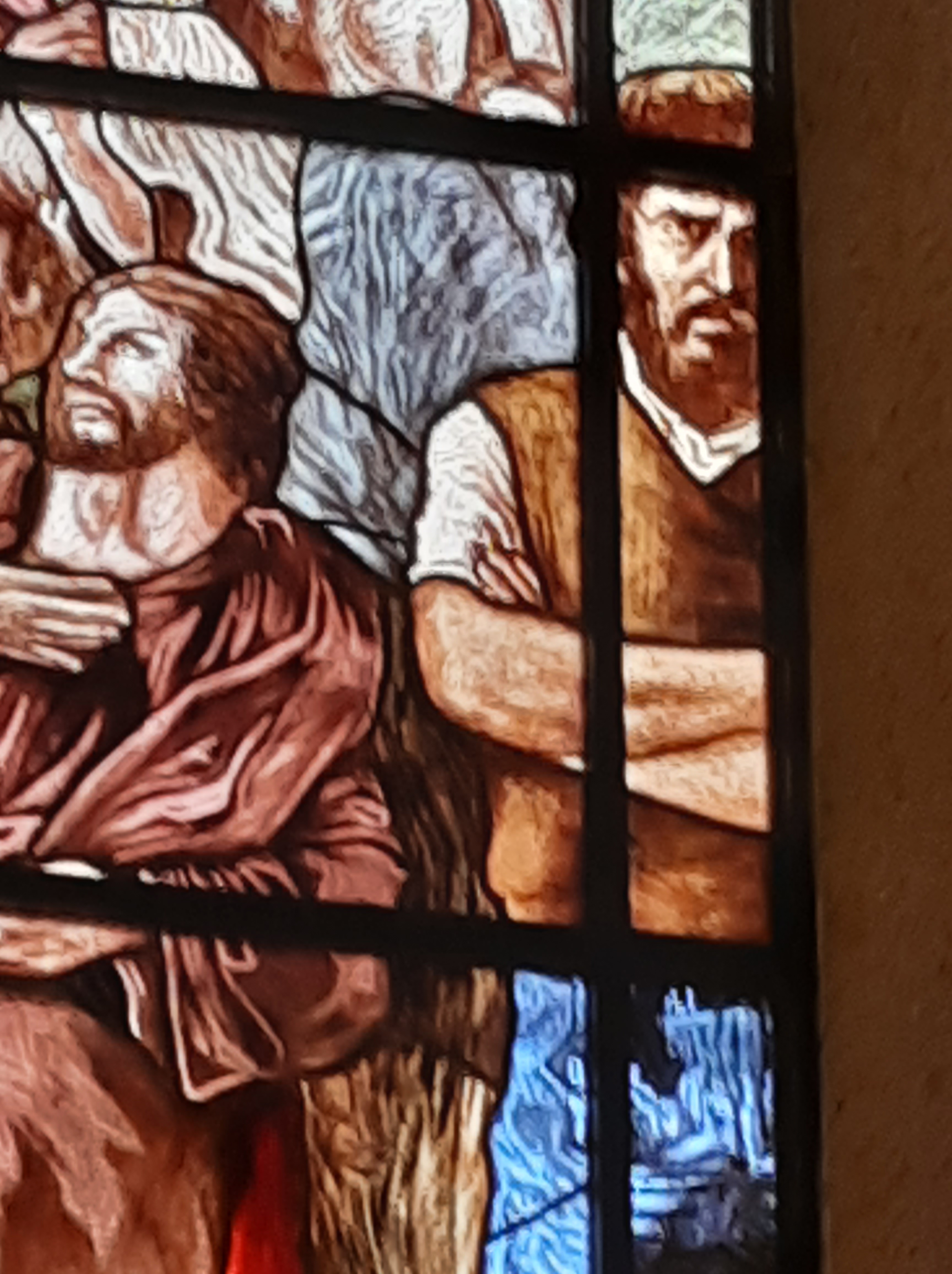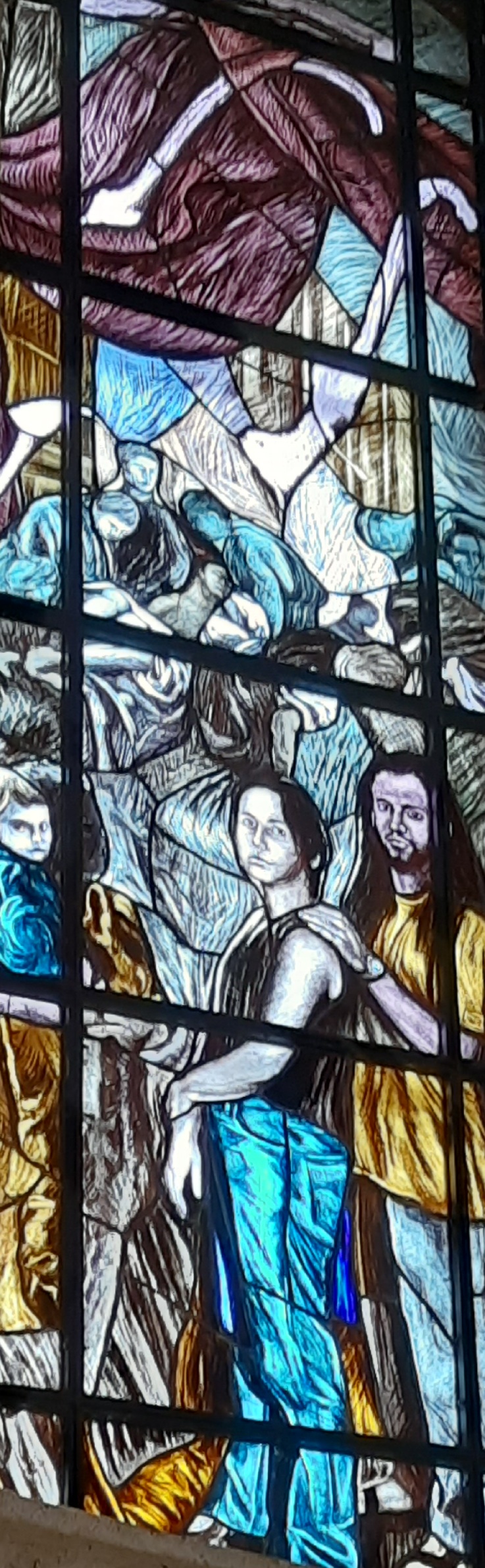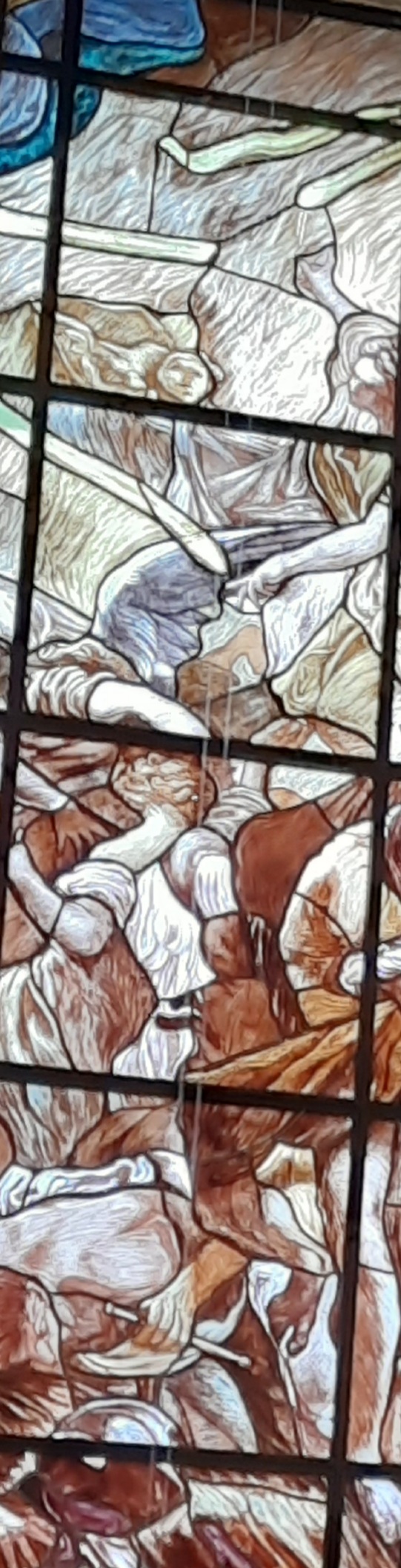 Di Giovanni ho più volte scritto su questo blog. Un maestro nella incisione e nella pittura. Le vetrate vanno viste con piena luce, meglio al mattino o a mezzogiorno, dato che il lato maggiormente esposto alla luce della Chiesa è ad Est.