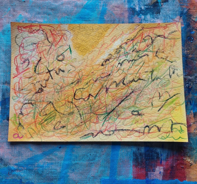 Per ciascuna di queste coppie (per esempio lettera a accoppiata alla parola abisso) ho dipinto una piccola opera su carta nel formato 12,5 cm x 18 cm. Sono acrilici e matite colorate.