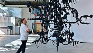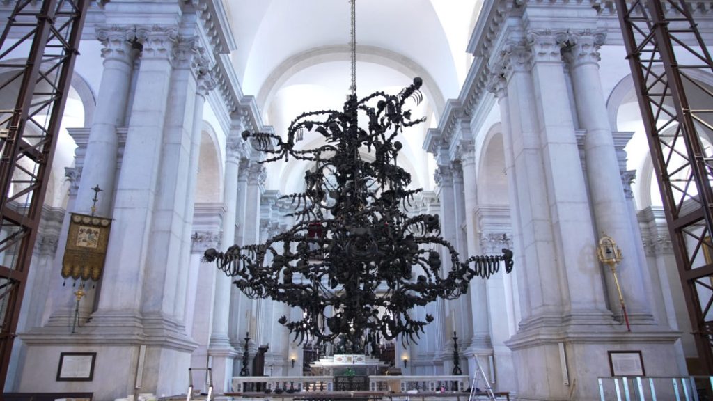 Ci dice Bortolotti che la Commedia Umana è un’opera composta da oltre duemila pezzi di vetro soffiato a mano e fuso dai maestri vetrai di Berengo Studio di Murano. Questi pezzi di vetro compongono un enorme lampadario del peso di quattro tonnellate largo oltre sei metri e alto nove. I pezzi di vetro sono stati soffiati ad imitazione di ossa umane. La luce quindi diffonde ombre dalle forme di ossa.